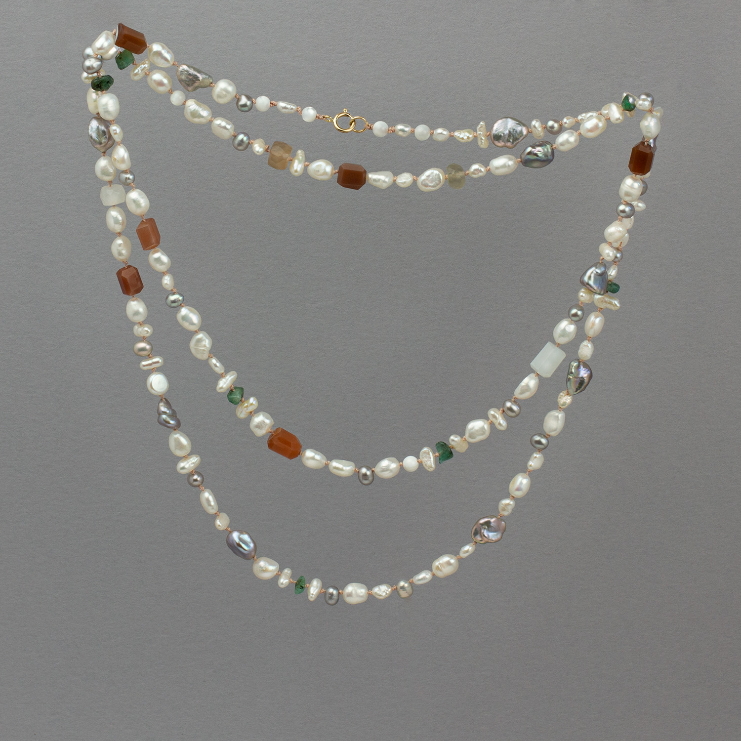 A long strand of mixed pearls, moonstone, and emeralds on soft pink silk, finished with a 9ct gold clasp.